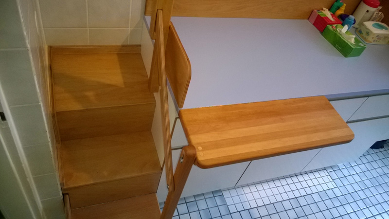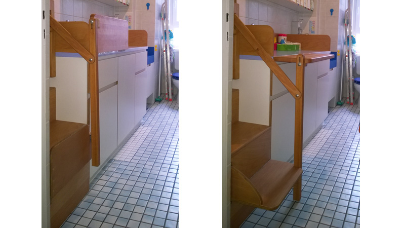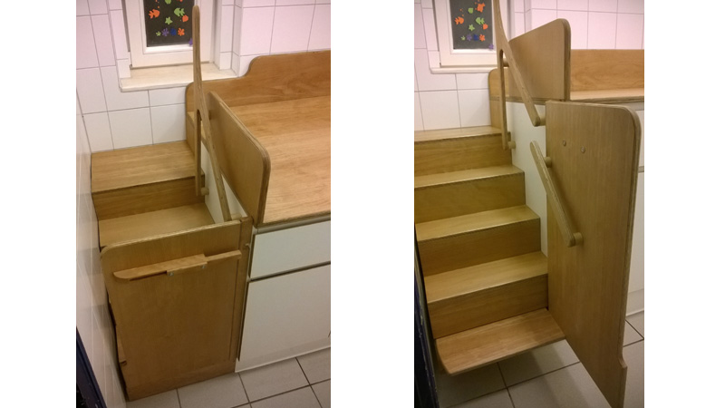 Die ausdrehbare Treppe dient auch als Windeldepot.