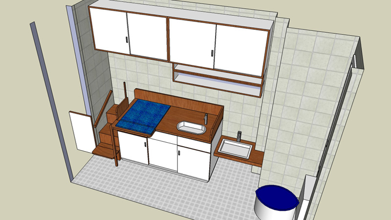 mit Treppe und Säuglingspflegebecken.